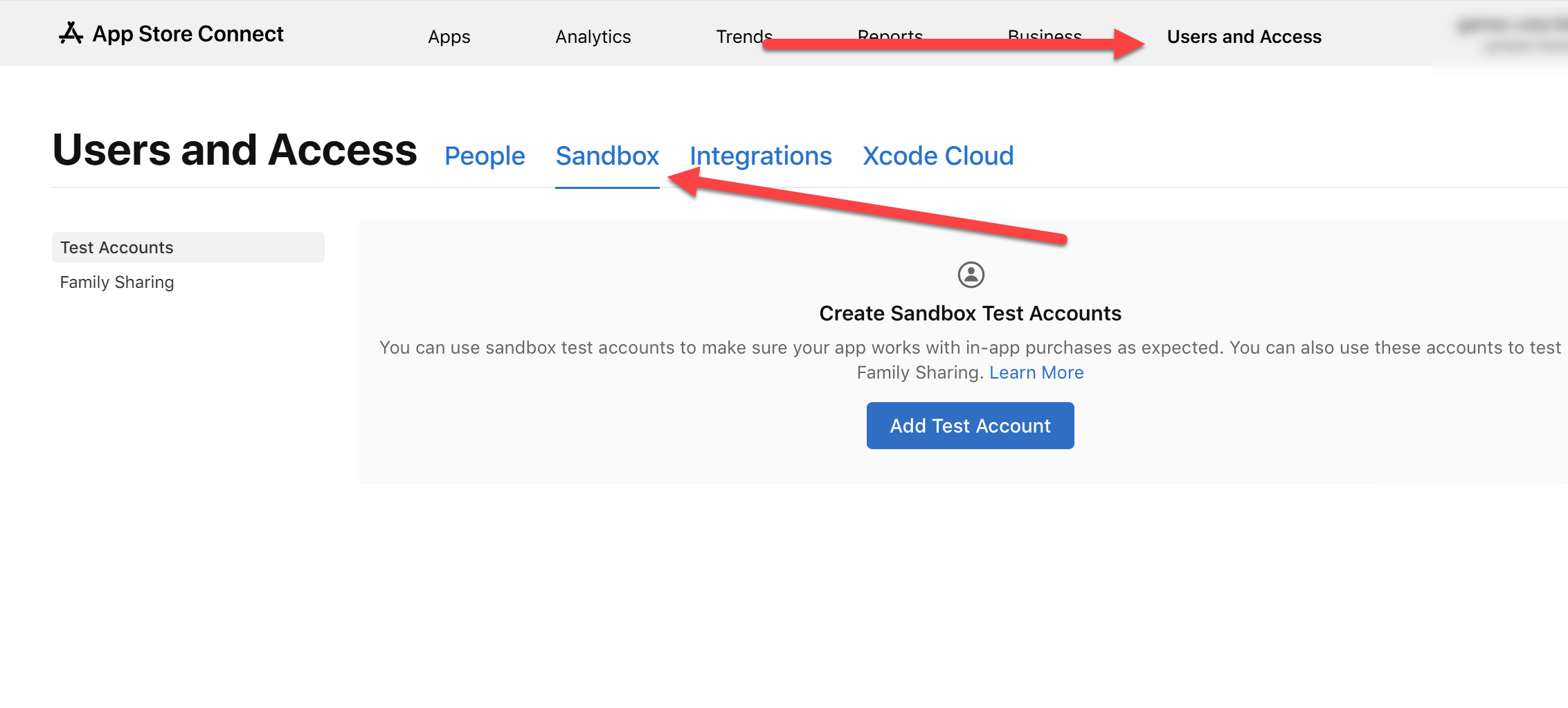 1)App Store Connect의 상단 Users and Access(사용자 및 액세스) 메뉴에서 Sandbox(샌드박스)로 이동합니다.