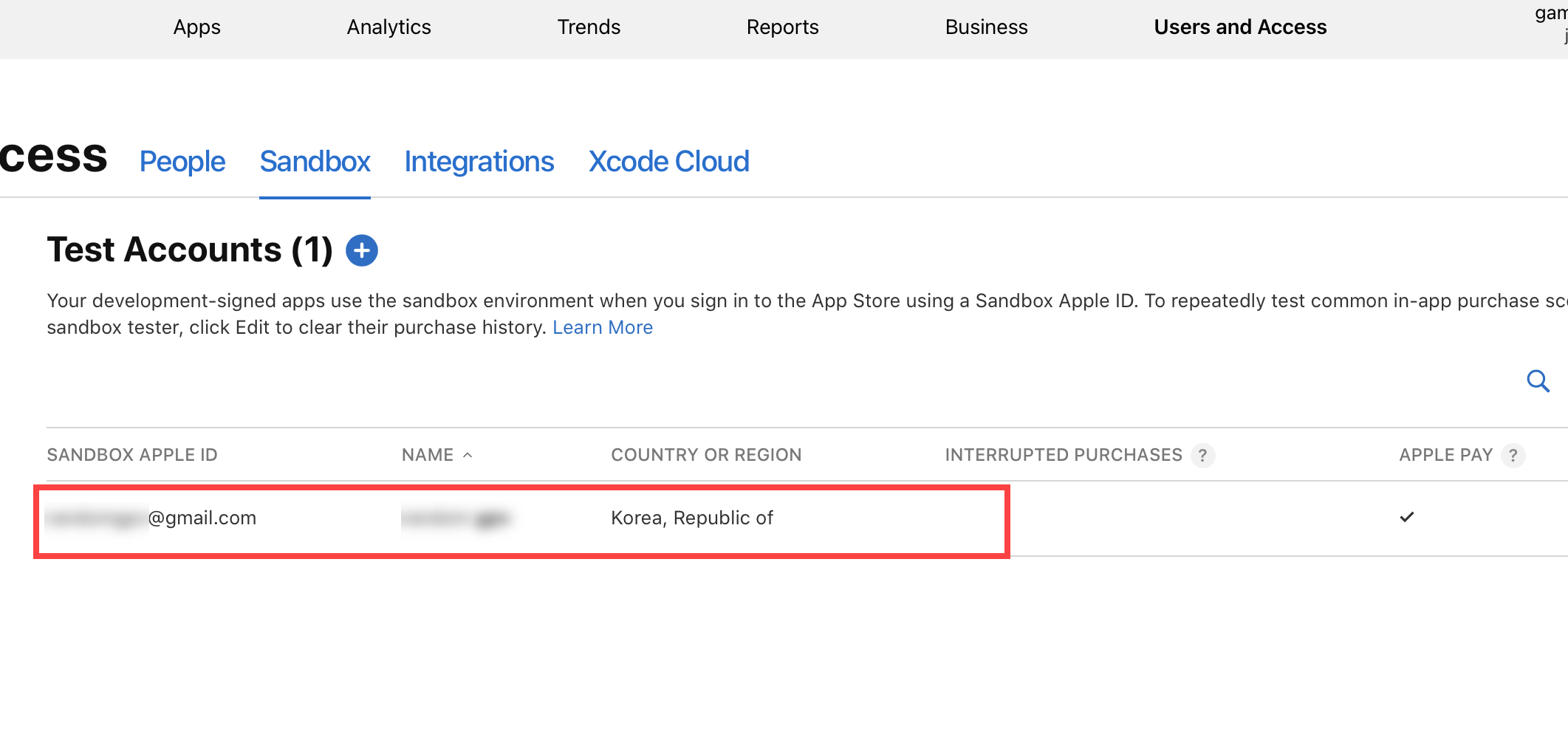 4)샌드박스 계정이 추가된것을 확인할수있습니다. 해당 계정으로 앱의 인앱구매 테스트를 진행할수있습니다.