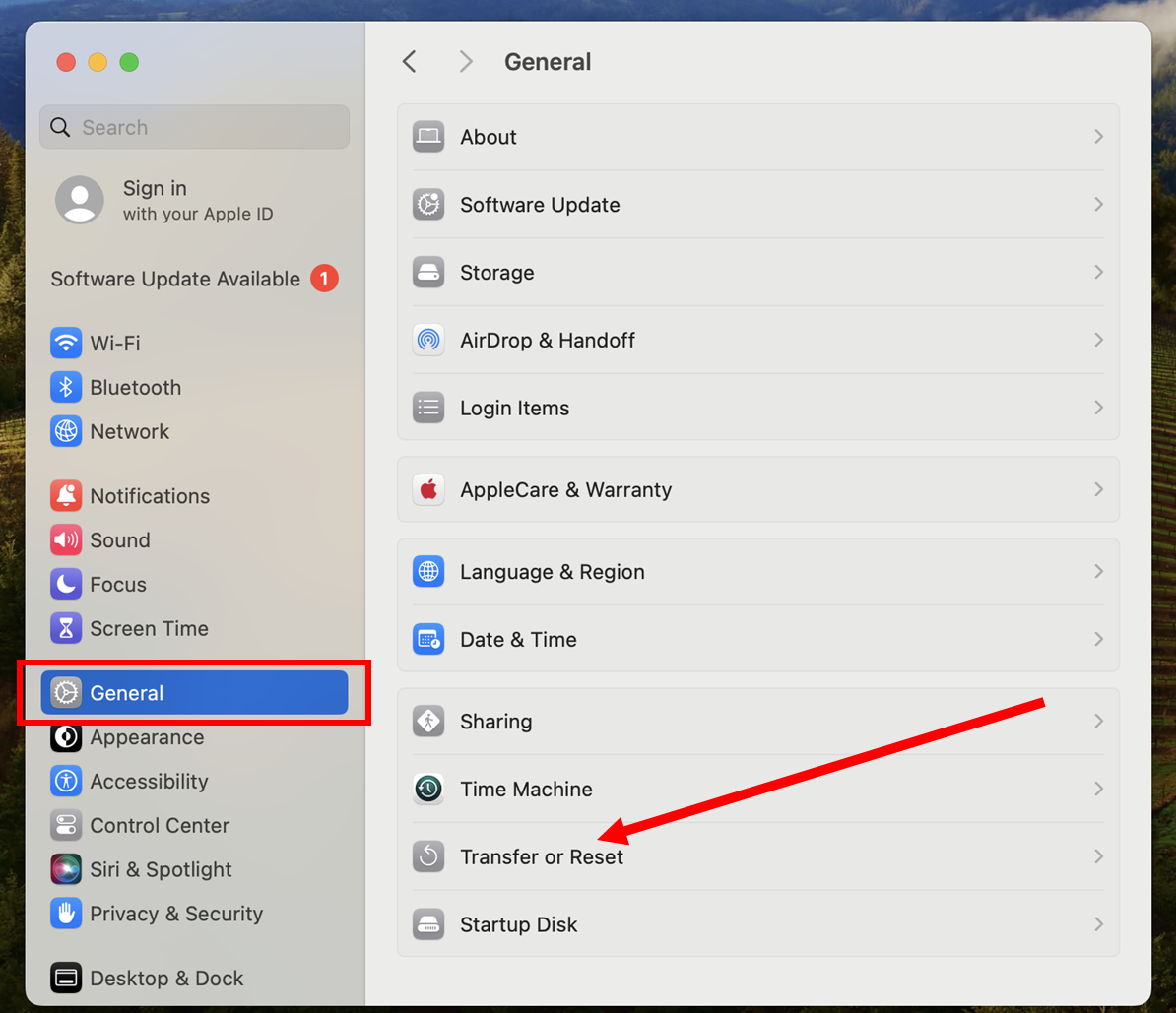 2)일반(general)에서 전송 또는 재설정(transfer or reset)으로 이동합니다.