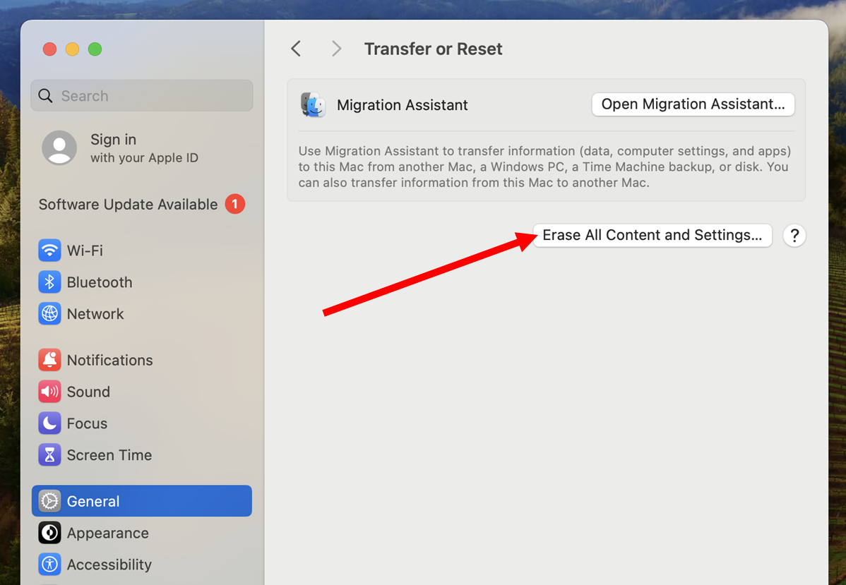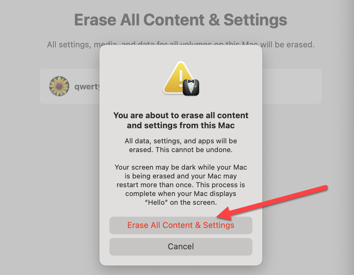 모든 콘텐츠 및 설정 지우기는 맥(Mac)의 모든 데이터, 설정 및 앱을 삭제하며 이 작업은 취소할 수 없습니다.