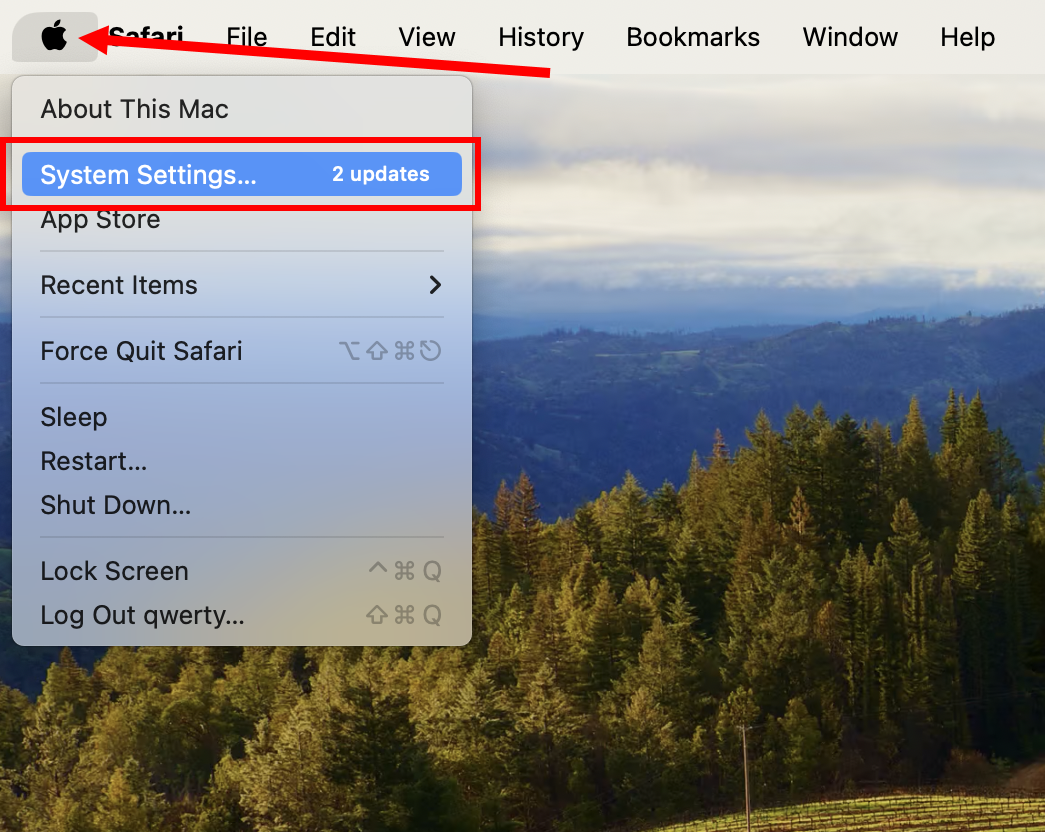 1)좌측 상단의 애플 메뉴에서 시스템 설정(system settings)으로 이동합니다.