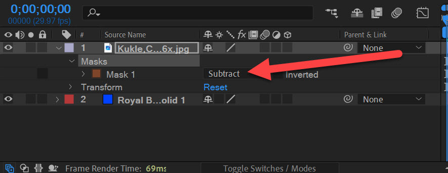 7)또는 Mask의 혼합 방법을 Subtract로 변경합니다.
