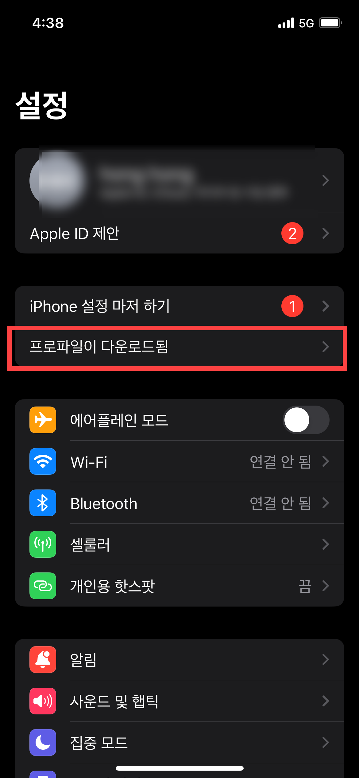 6)아이폰 설정 메뉴에서 프로파일이 다운로드됨으로 이동합니다.