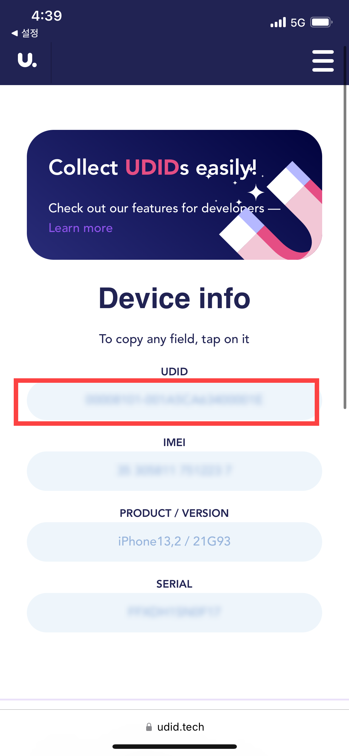 8)웹사이트에서 아이폰 장치 UDID를 표시합니다.