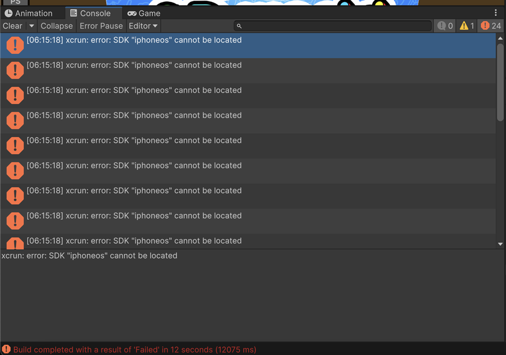 유니티 iOS 빌드 오류 xcrun: error: SDK "iphoneos" cannot be located