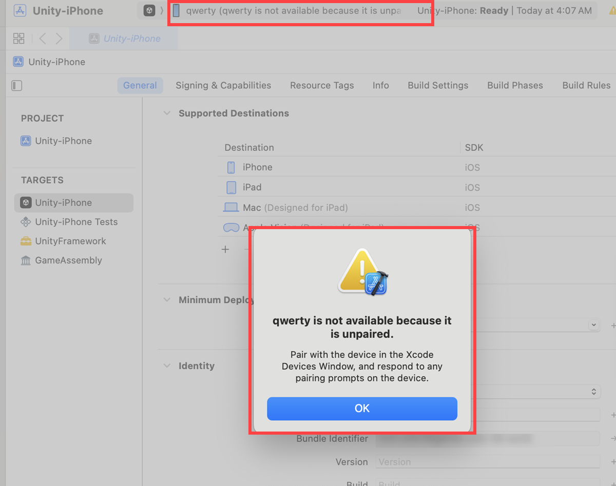 Xcode에서 iOS 장치 페어링 메시지 is not available because it is unpaired