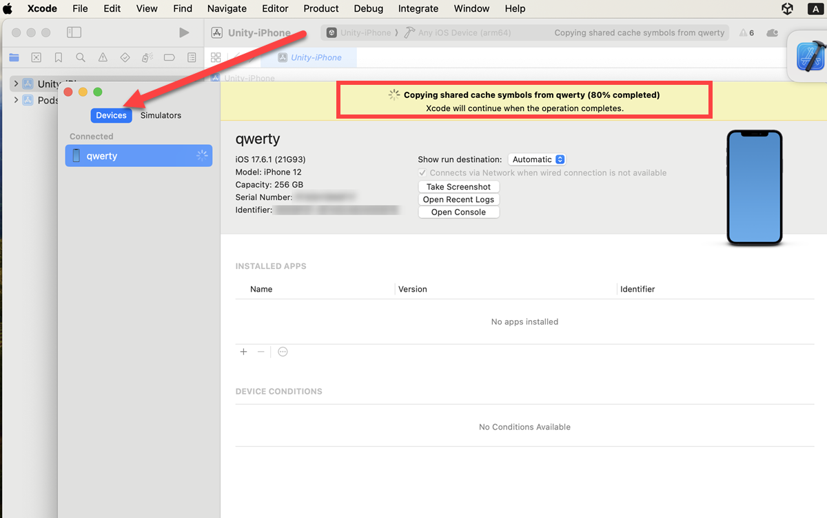 공유된 캐시 심볼을 복사하는 작업이 진행중이며 이 과정이 완료되면 장치와의 연결이 정상적으로 이루어지고 이후 Xcode에서 정상적으로 디버깅, 빌드 및 실행 등이 가능합니다.
