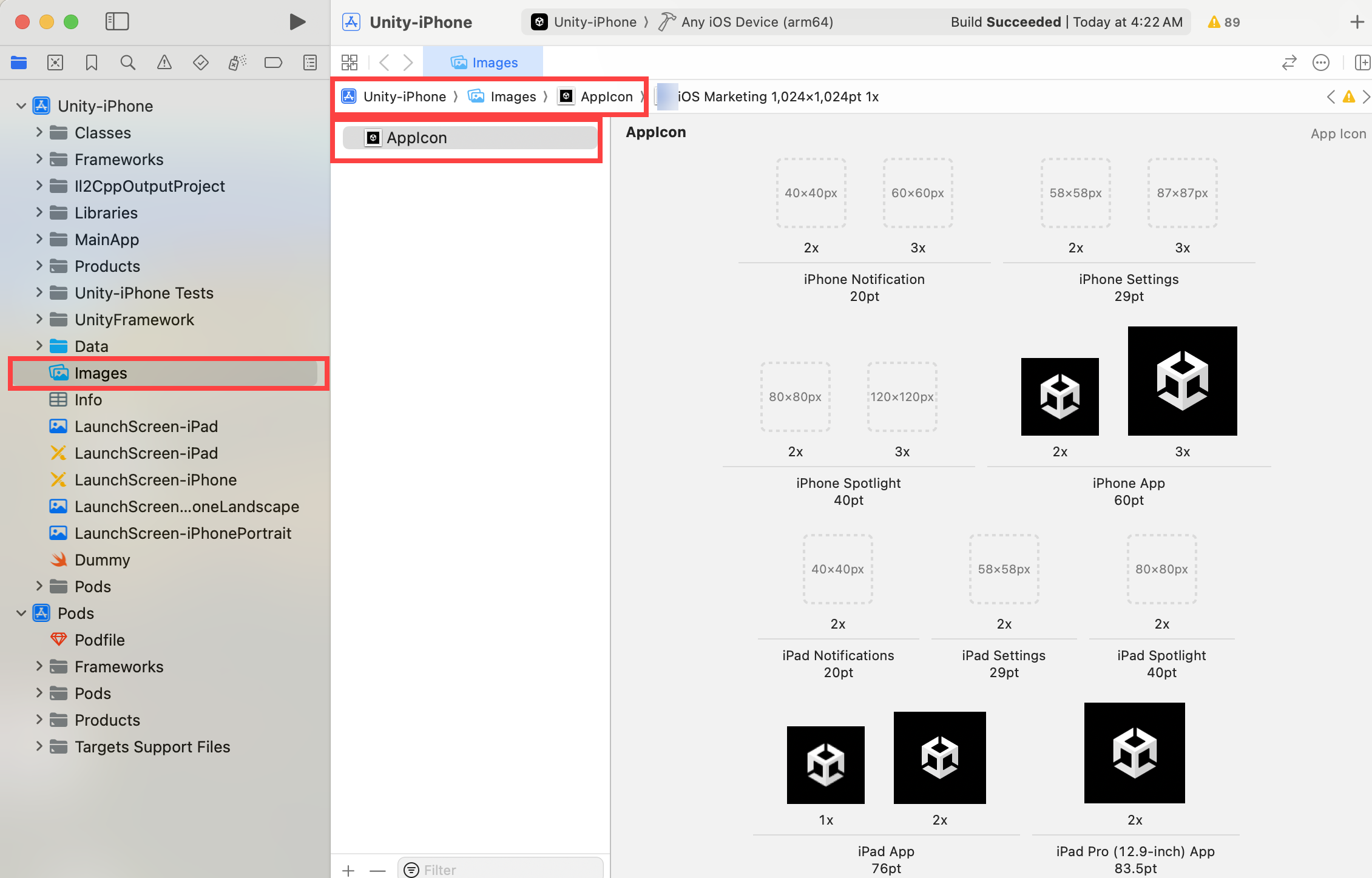 유니티(Unity)에서 빌드한 Xcode 프로젝트에서 iOS 앱 아이콘(App Icon) 설정하기