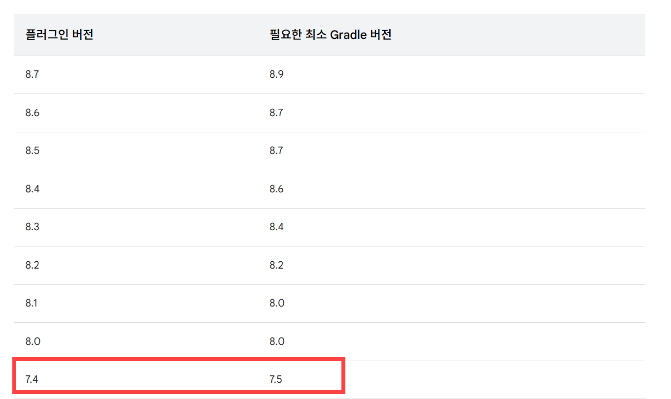 각 버전의 Android Gradle 플러그인에 필요한 Gradle 버전
