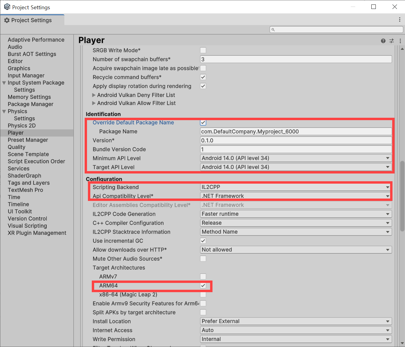 NETframework 설정, Scripting Backend(IL2CPP), Api Compatibility Level(.NET Framework), ARM64