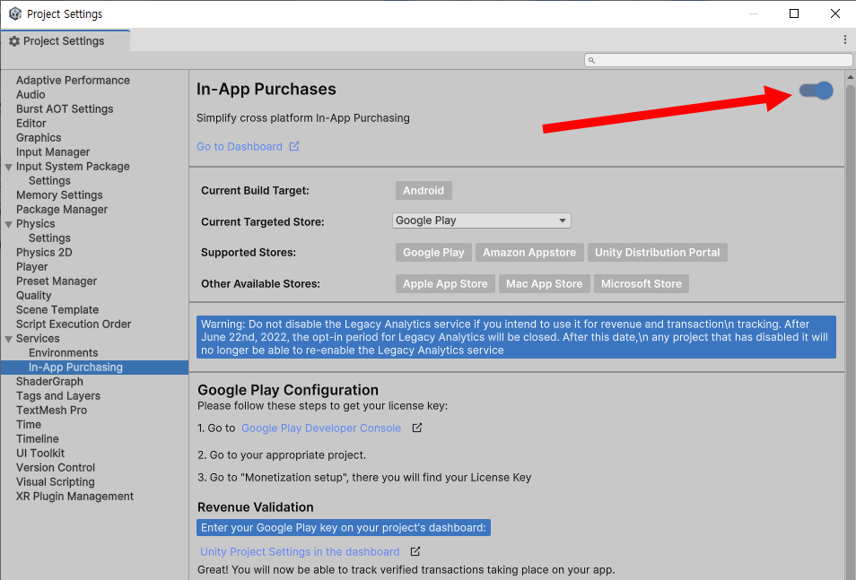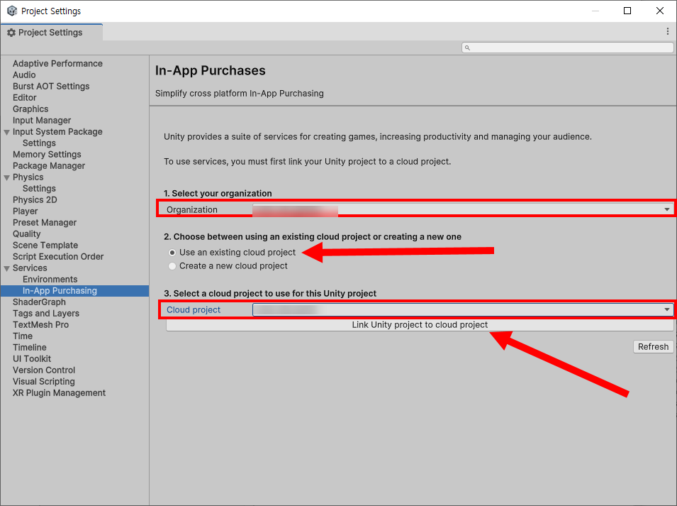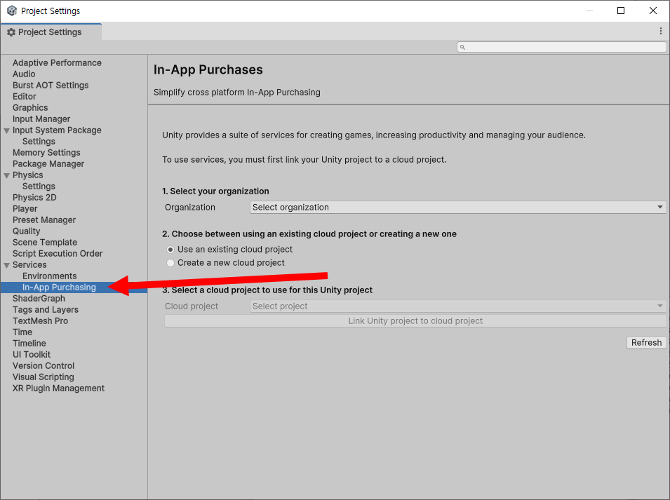 프로젝트 설정(project settings)의 In-app purchasing에서 기존의 클라우드 프로젝트 연결(Link Unity project to cloud project)하고 in-app purchasing 서비스 활성화