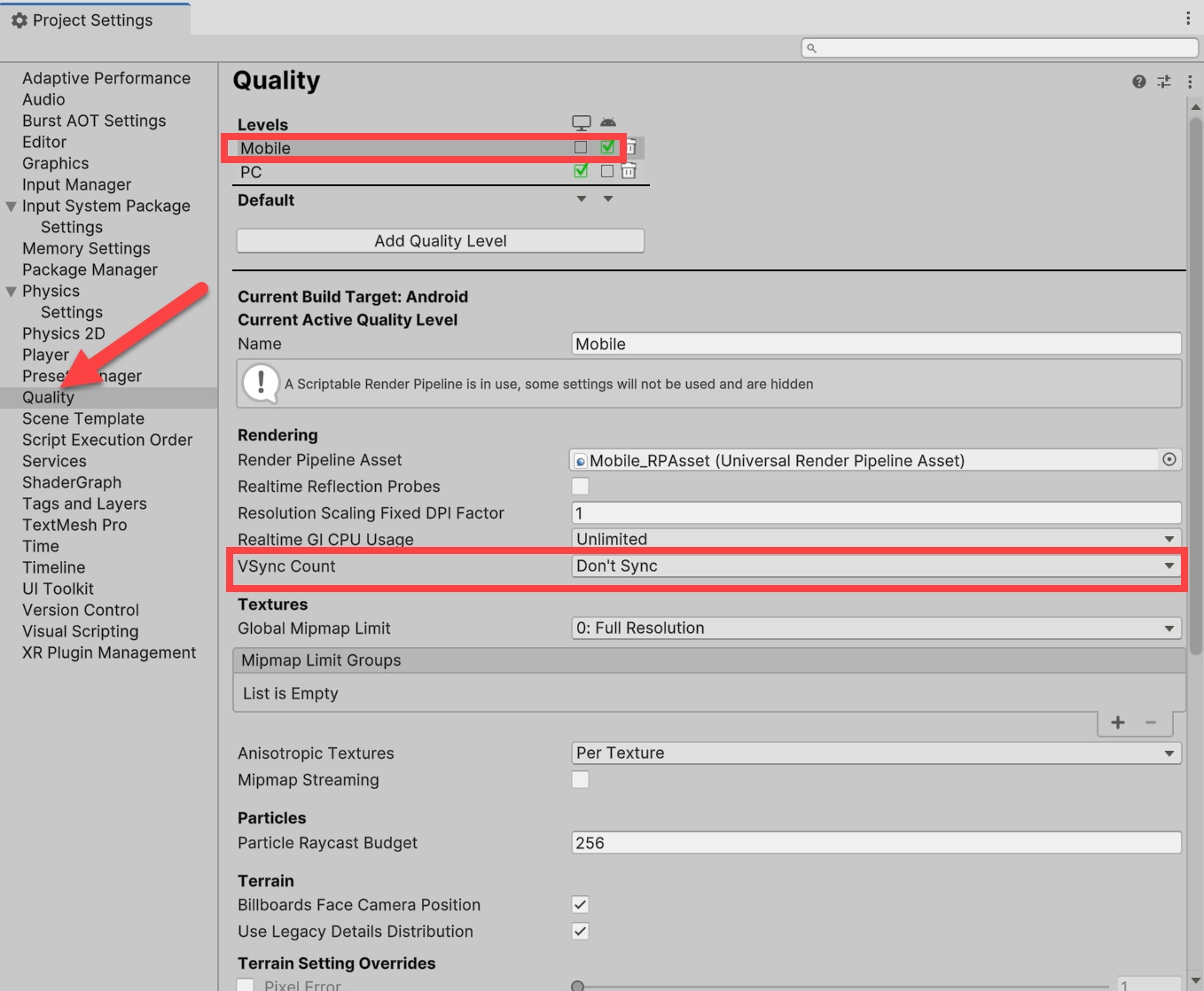 Quality에서 안드로이드 품질 수준(Levels) 선택 및 설정 - VSync Count