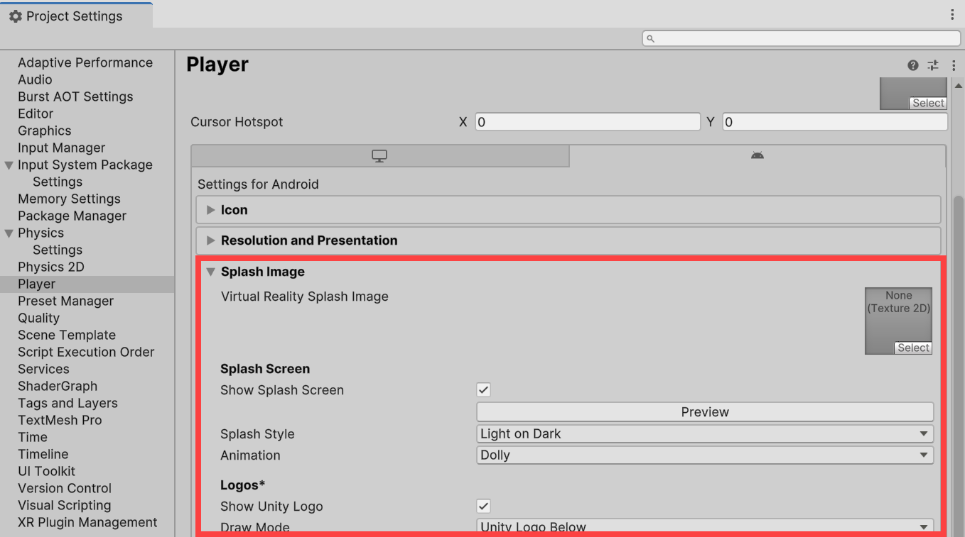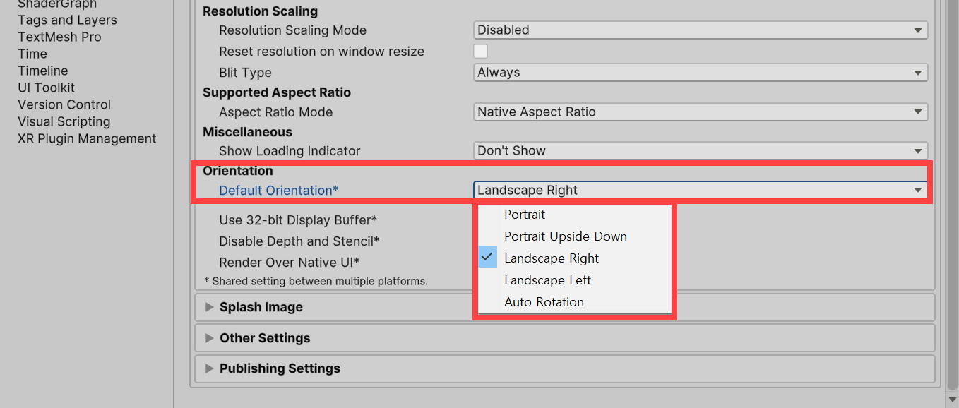 Icon(아이콘), Orientation(오리엔테이션), Splash Image 설정