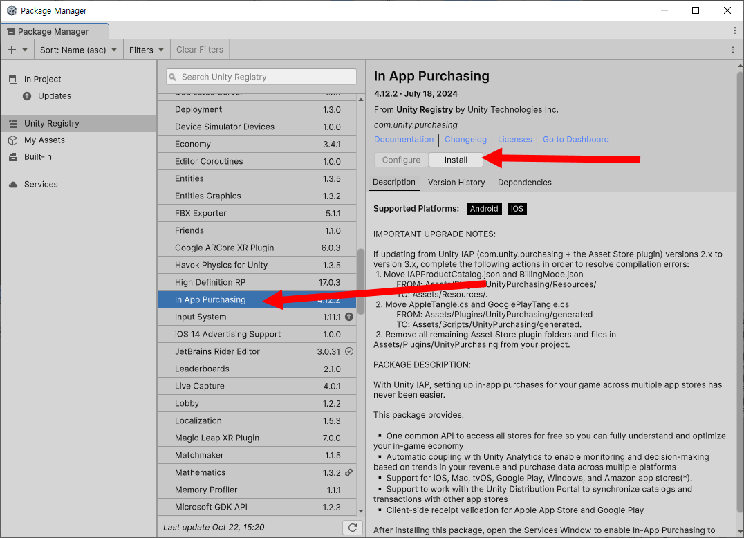 패키지 관리자(package manager)에서 IAP 패키지 설치