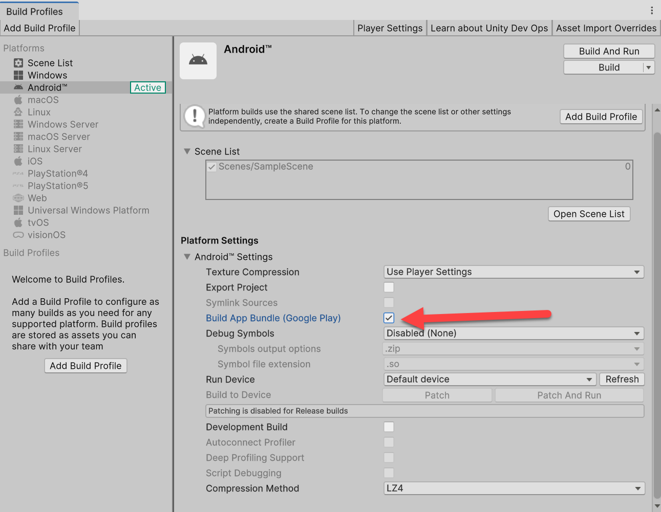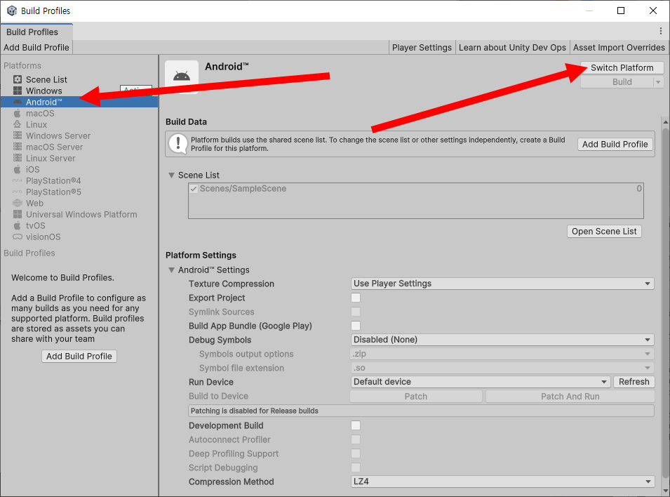 안드로이드 플랫폼으로 변경(switch platform), Scene List에 씬 추가