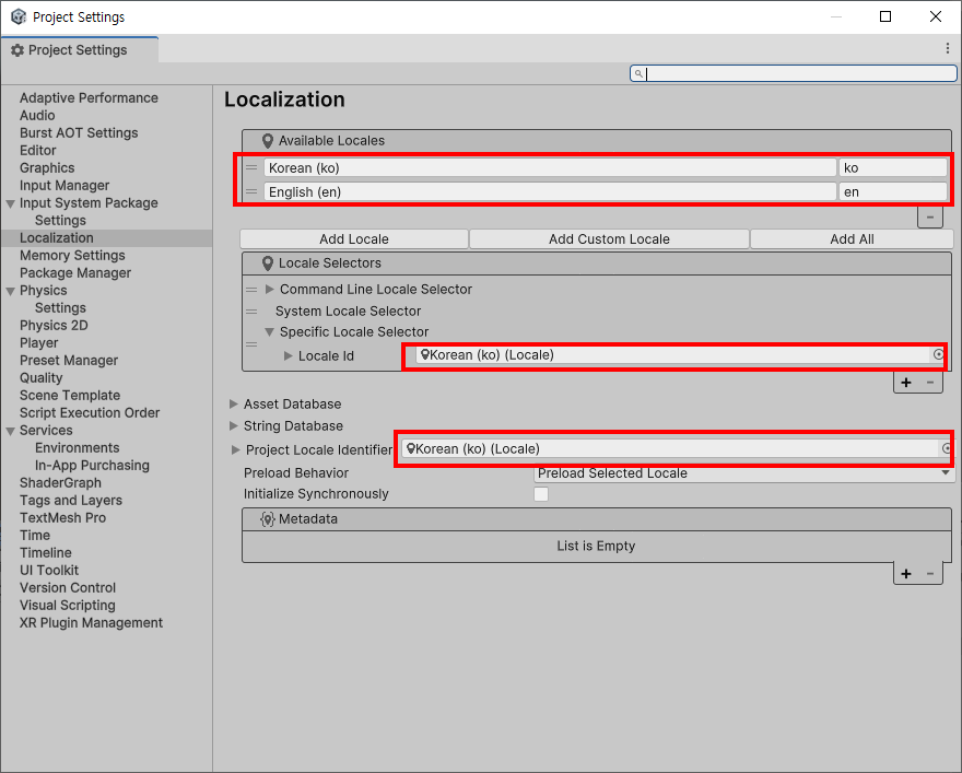 프로젝트에 새로운 Localization Settings을 생성하고 locale 추가 및 설정