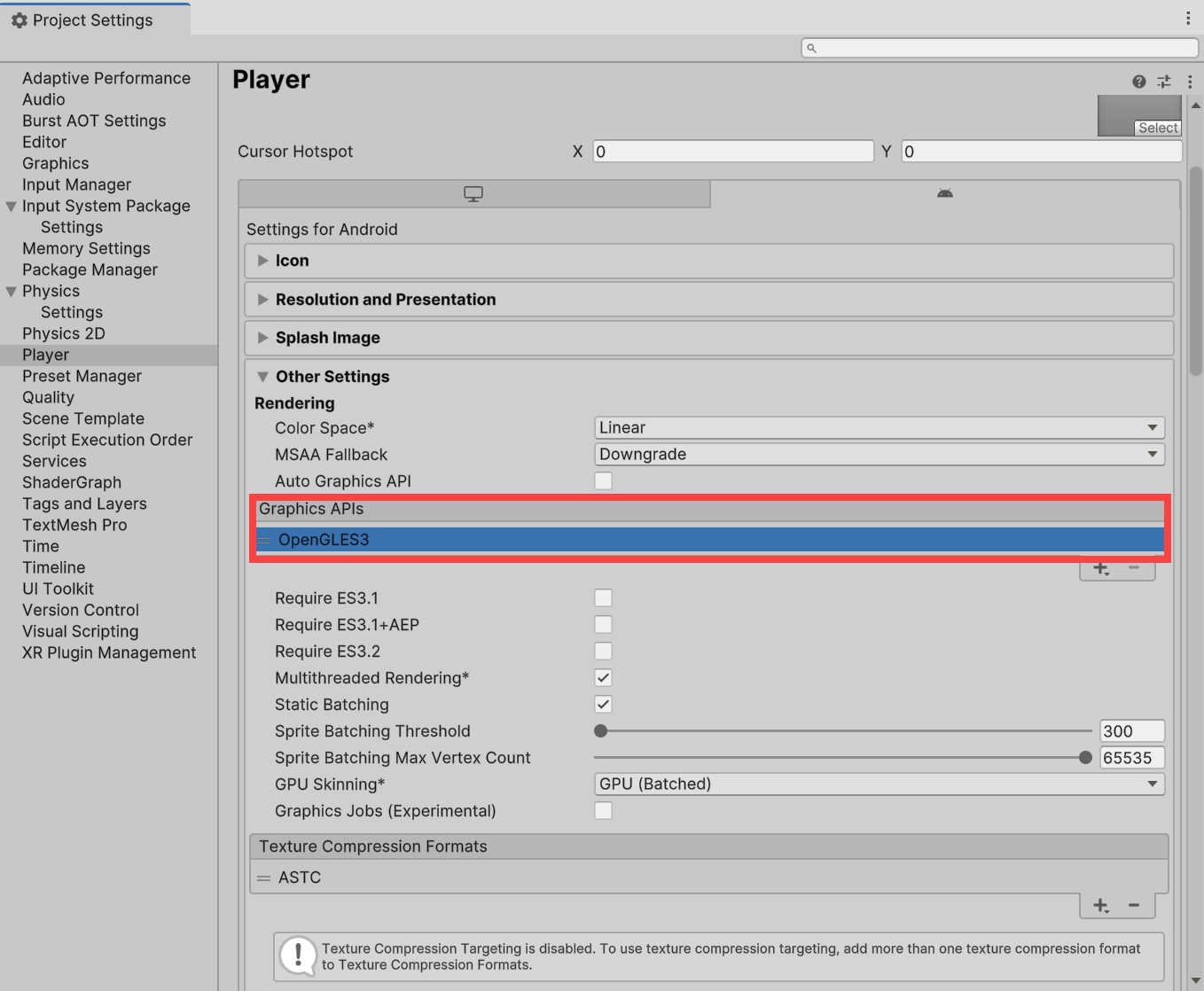 Graphics APIs 설정(Vulkan 제거)