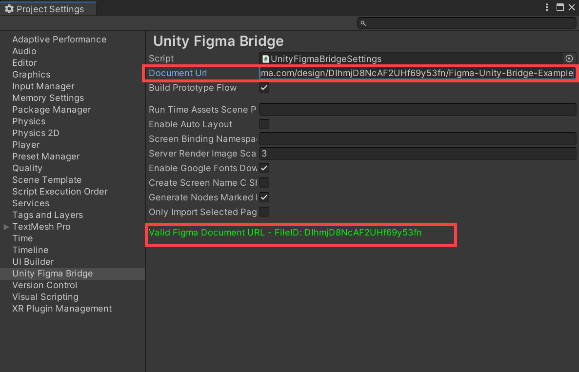 6)Document URL에 프로젝트에 가져오기할 피그마(figma) 문서의 URL를 입력합니다. 해당 URL이 유효하면 하단에 Valid Figma Document URL - FileID라고 표시합니다.