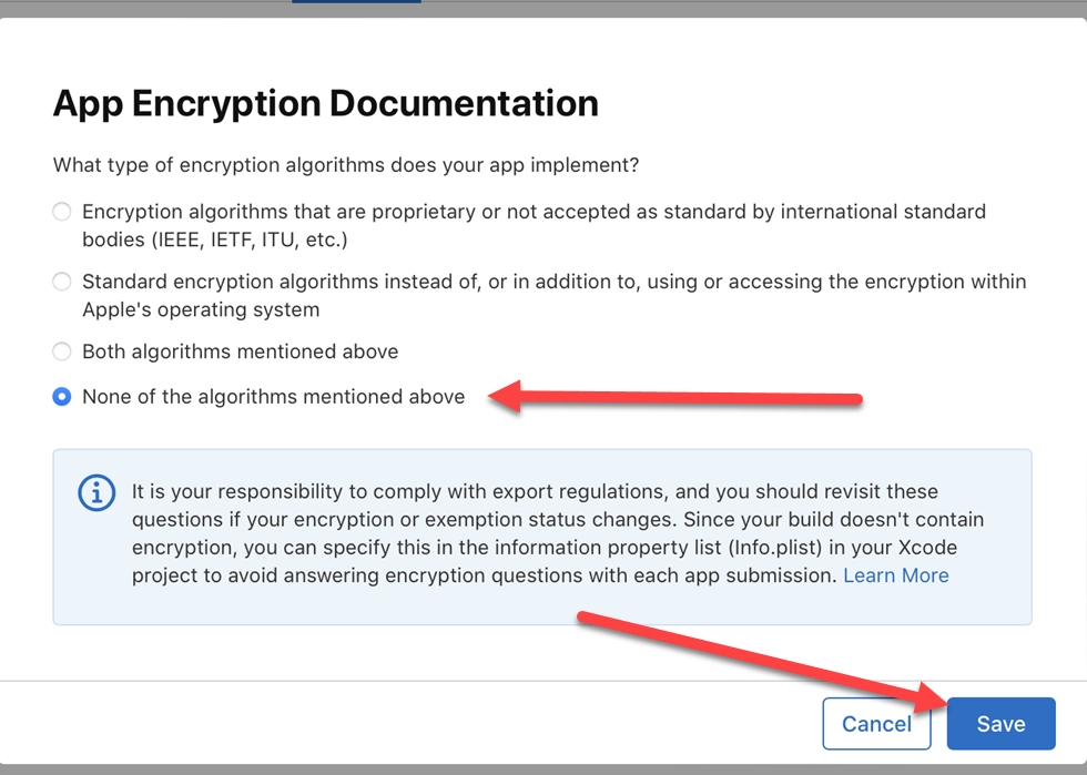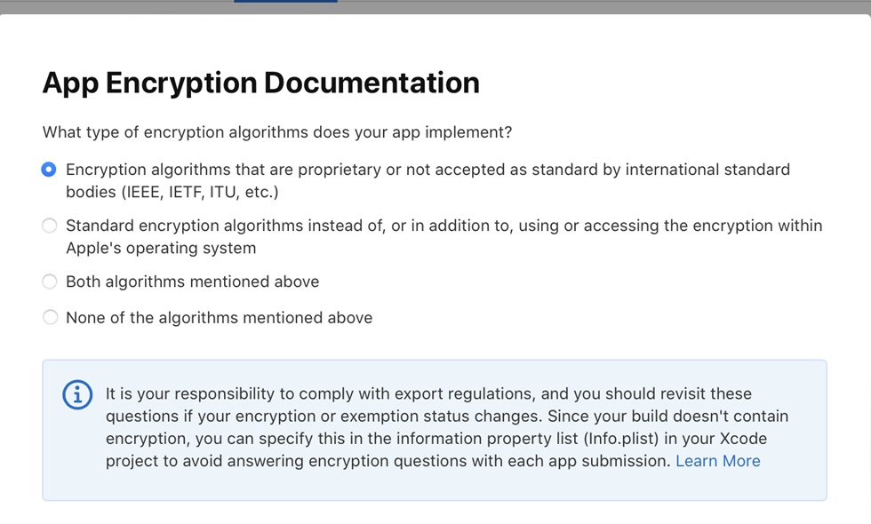(수출 규정을 준수하는 것은 귀하의 책임이며 암호화 또는 면제 상태가 변경되면 이러한 질문을 다시 살펴봐야 합니다. 빌드에 암호화가 포함되어 있지 않으므로 Xcode 프로젝트의 정보 속성 목록(Info.plist)에서 이를 지정하여 각 앱 제출 시 암호화 질문에 답하지 않아도 됩니다)