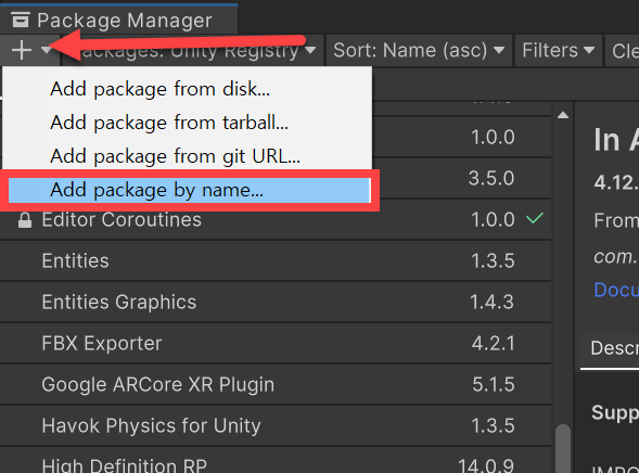 2)패키지 관리자 좌측 상단의 +버튼을 클릭하고 add package by name을 선택합니다.