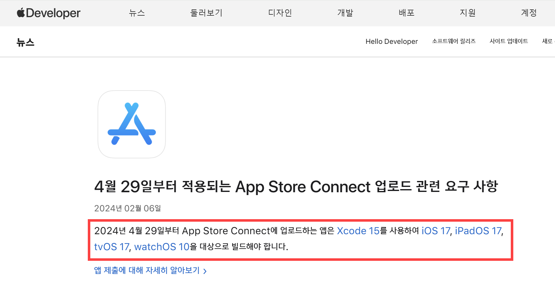 애플 개발자 웹사이트의 뉴스 메뉴에서 앱 업로드 및 제출을 위한 새로운 빌드 대상 요구사항을 공지합니다.