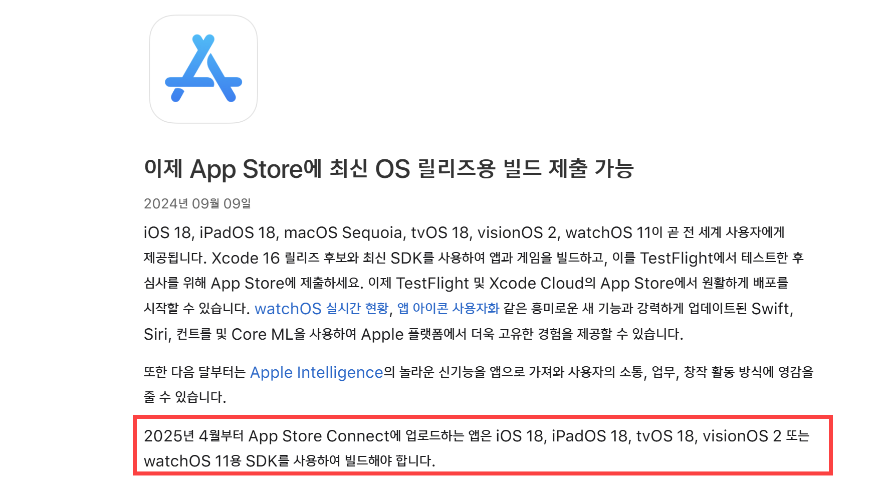 2025년 4월부터 앱스토어 커넥트(App Store Connect)에 업로드하는 앱은 Xcode 16(릴리즈 후보)와 iOS 18 SDK를 사용하여 빌드해야합니다.