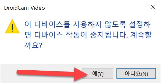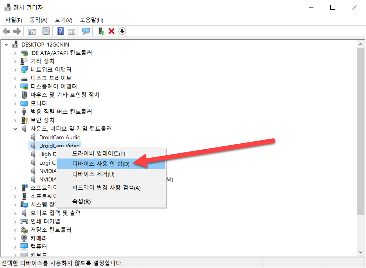 4)Droidcam Audio, Droidcam Video를 디바이스 사용 안함으로 설정합니다.