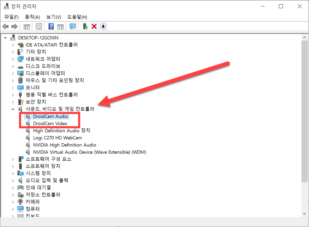3)사운드, 비디오 및 게임 컨트롤러에서 드로이드캠(Droidcam Audio, Video)가 사용중인것을 확인할수있습니다.