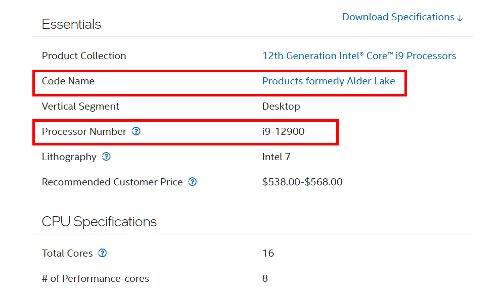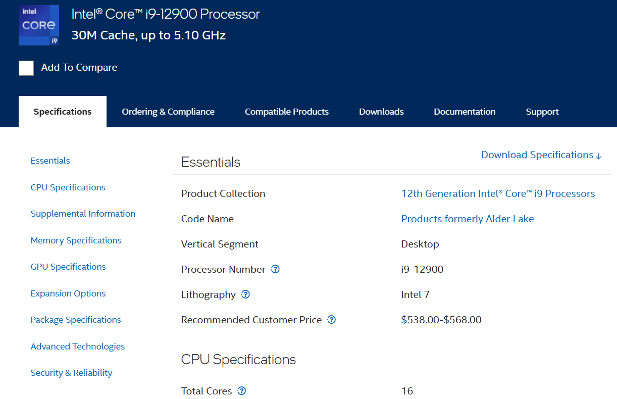 5)사양을 확인하려는 CPU 제품을 선택합니다(Intel Core i9-12900 Processor)