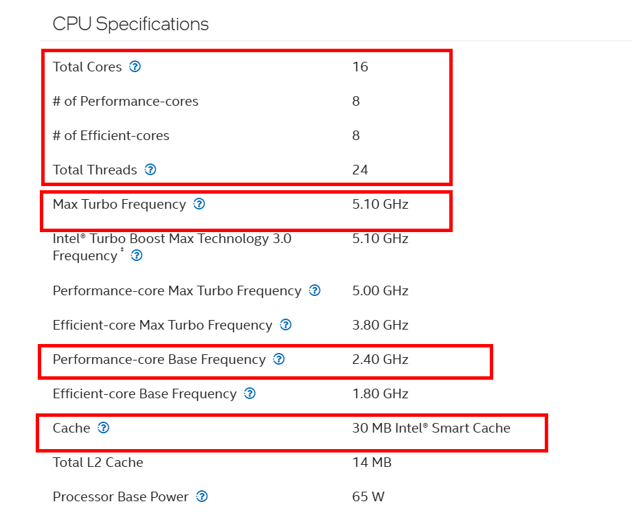 Max Turbo Frequency(최대 클럭 속도), Performance-core Base Frequency(기본 클럭 속도), Cache(캐시)