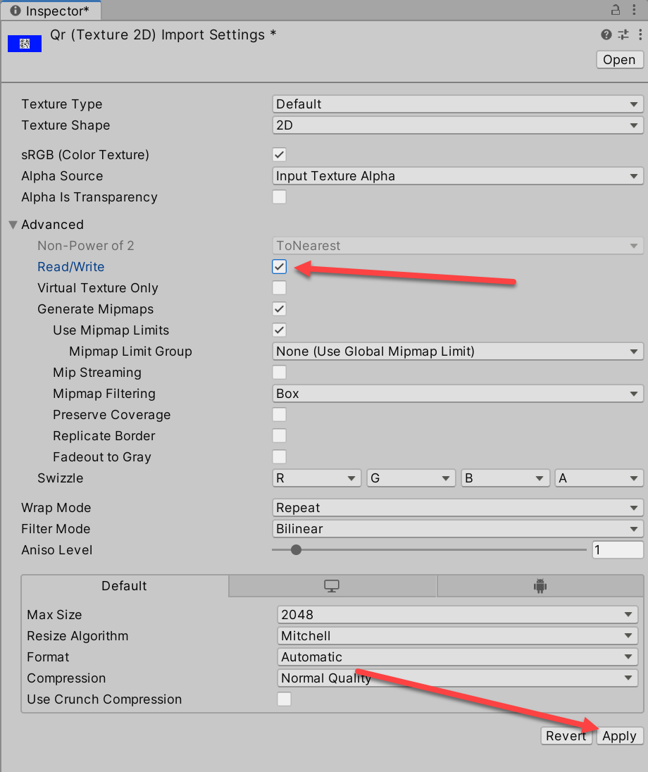 6)텍스처의 Read/Write 에체크하고 적용합니다(apply)