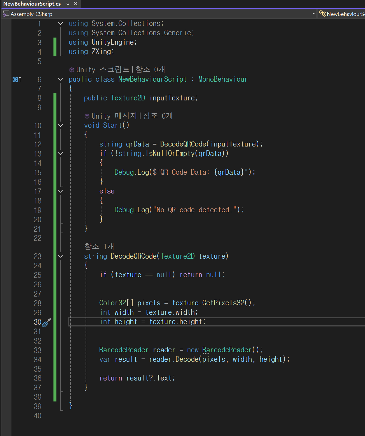 Decode 메서드를 사용하여 텍스처의 픽셀 데이터(pixels), 너비(width), 높이(height)를 입력받아 QR 코드를 디코딩한 결과(result)를 반환합니다.