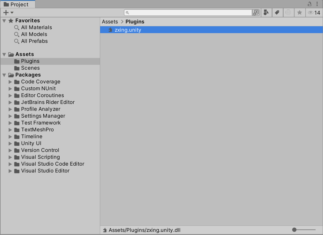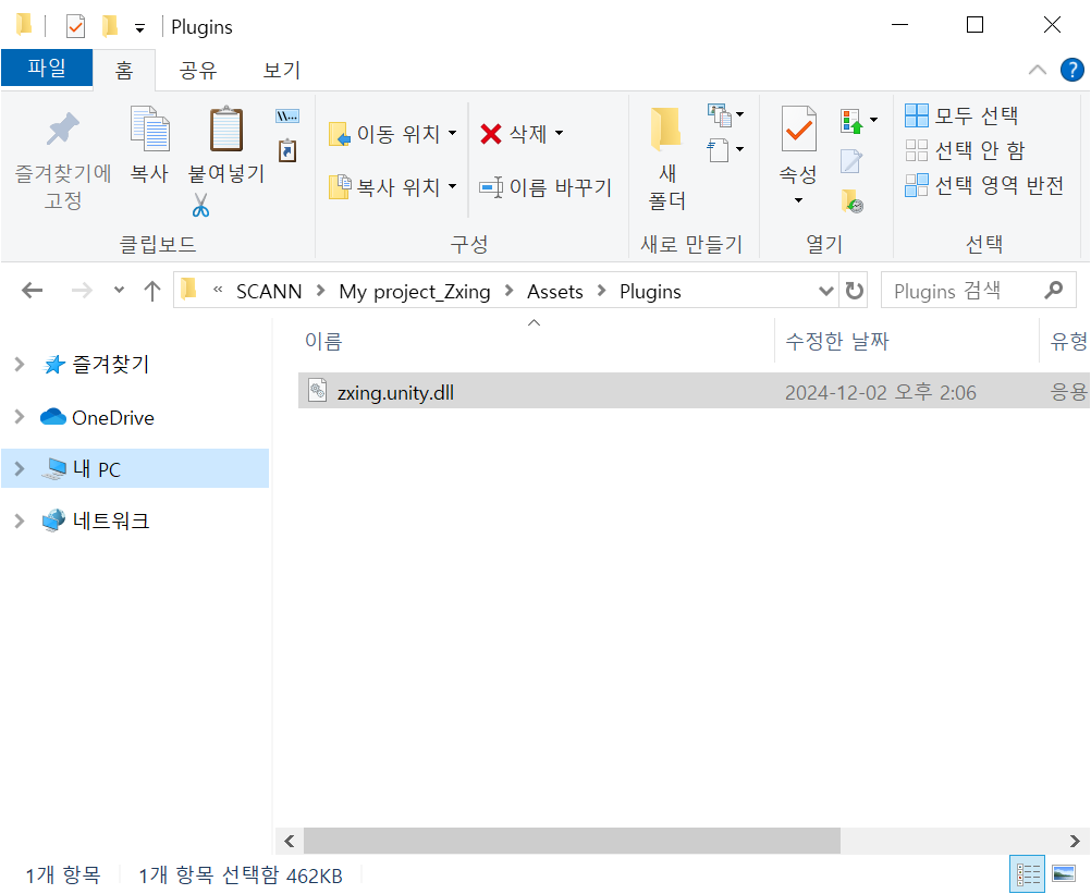 2)다운로드한 zxing.unity.dll 파일을 유니티 프로젝트로 가져오기하고 Assets/Plugins 폴더에 위치시킵니다.