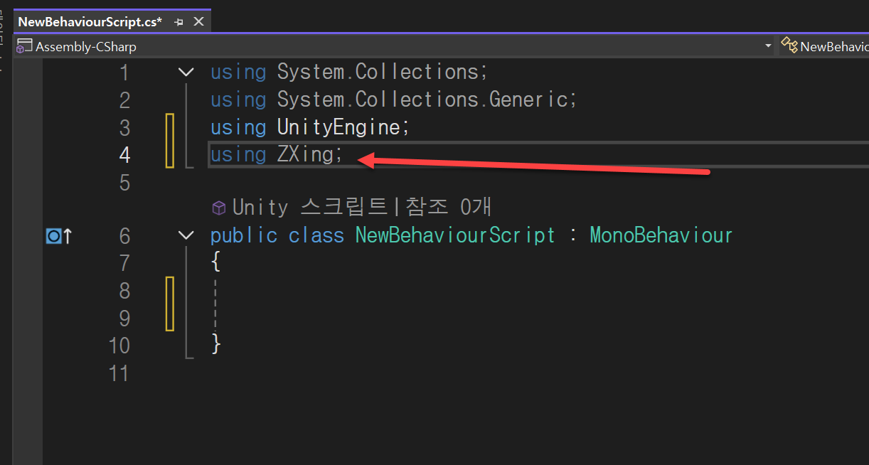 7)새로운 스크립트에서 ZXing 네임스페이스 선언합니다.
