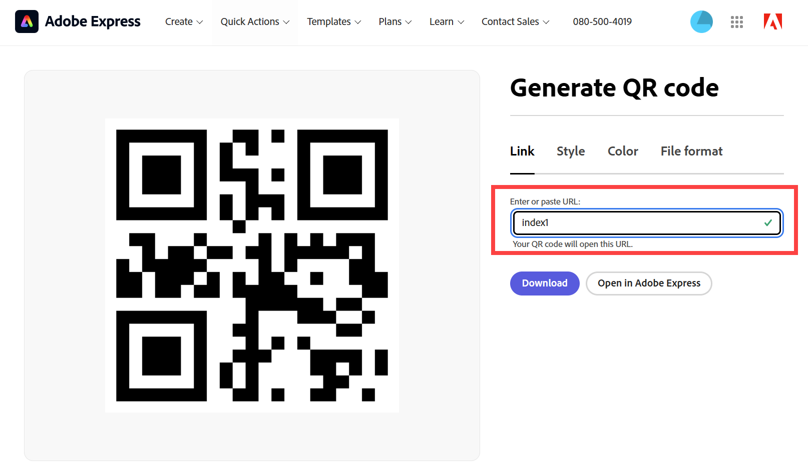 3)Adobe Express 웹사이트에서 QR 코드의 Raw text 또는 URL를 입력하고 download를 클릭하여 QR코드를 생성 및 다운로드합니다.