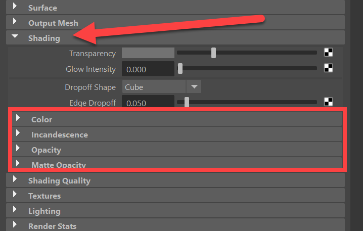 13)shading의 transparency(투명도), dropoff shape(컨테이너 경계에서 fade 방식), edge dropoff를 설정합니다.