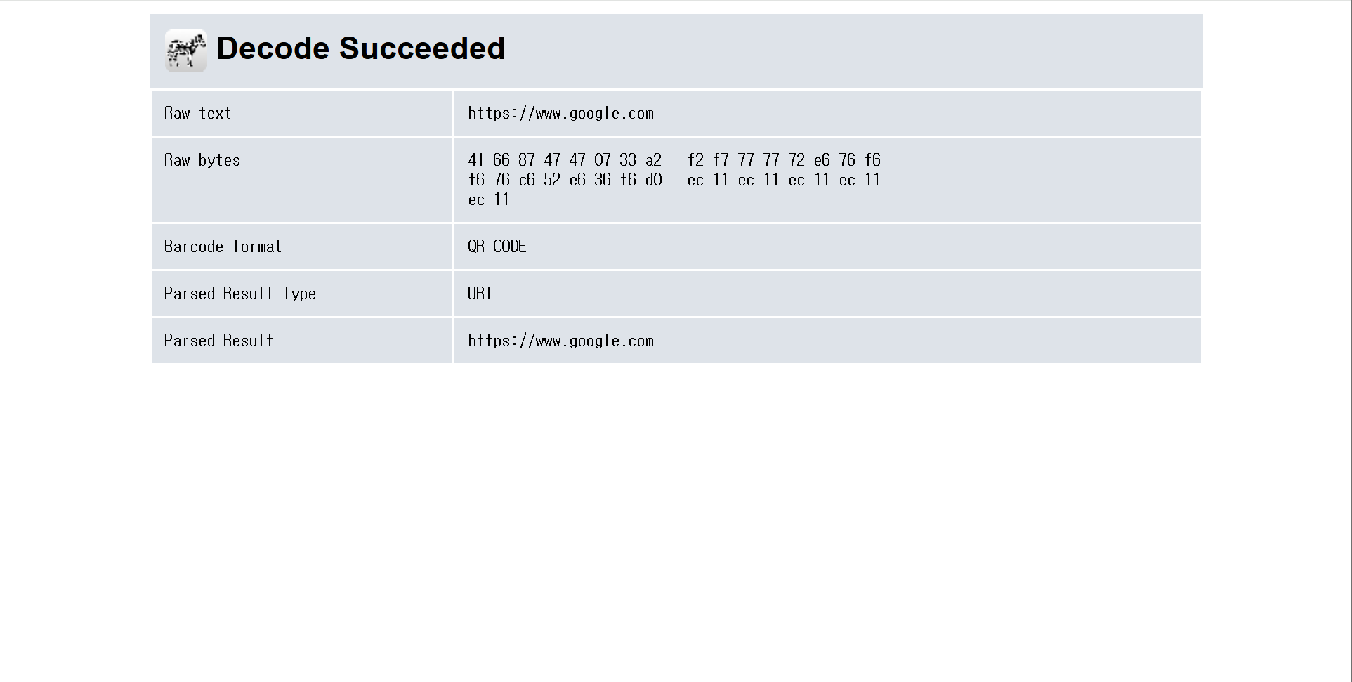 이미지 URL 또는 파일 업로드를 사용하여 제출한 이미지에서 바코드 또는 QR코드를 디코딩한 결과(Raw text, Raw bytes, BHarcode format, Parsed Result Type, Parsed Rsult)를 제공합니다. 지원되는 형식은 다음과 같습니다.