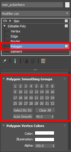 2)폴리곤 편집에서 모든 폴리곤의 스무싱 그룹(Smoothing Groups)를 제거합니다(Clear All)
