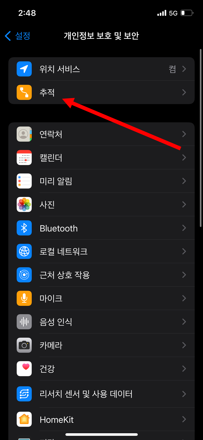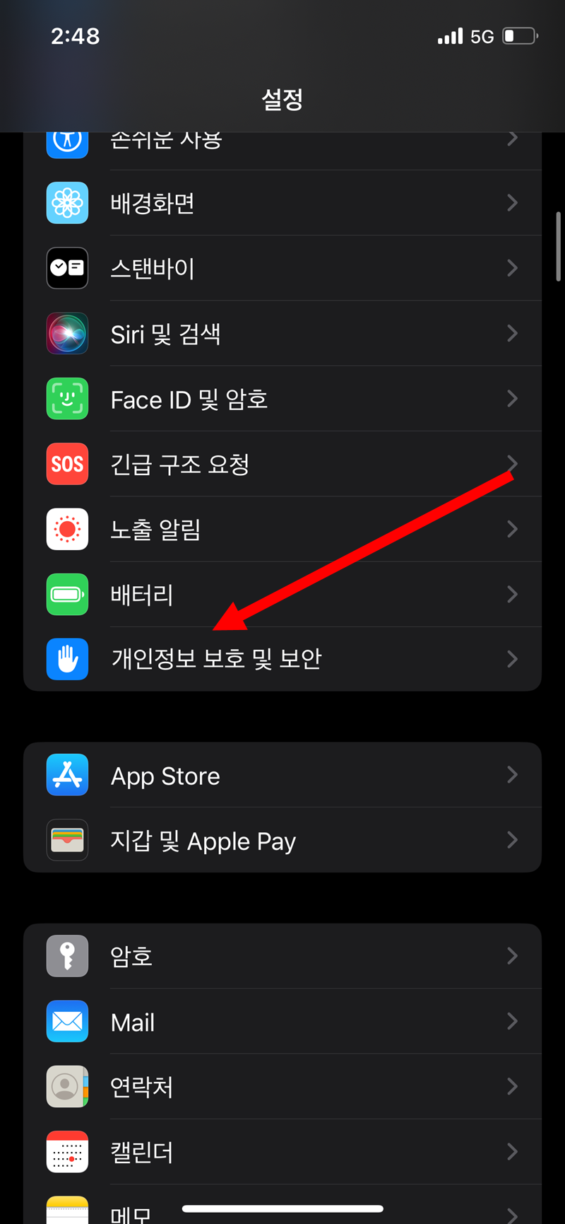 1)설정에서 개인정보 보호 및 보안으로 이동합니다.