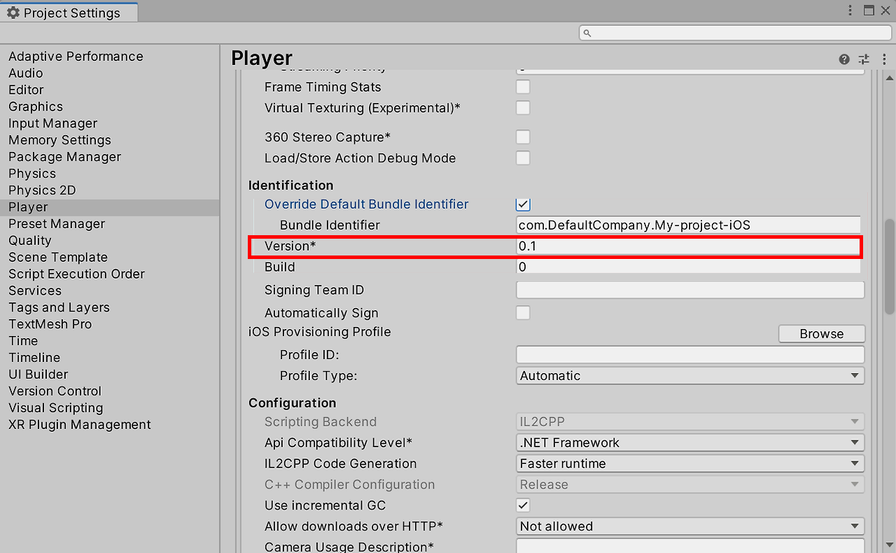유니티의 프로젝트 설정에서 버전(Version) 설정 및 확인