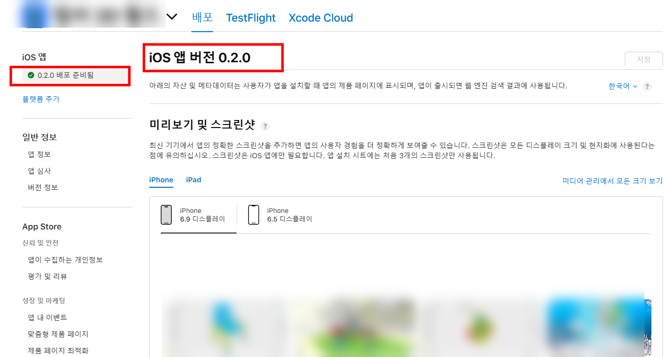 2)iOS 앱의 제출 준비중 또는 배포 준비됨 상태에서 버전 번호를 확인할수있습니다.