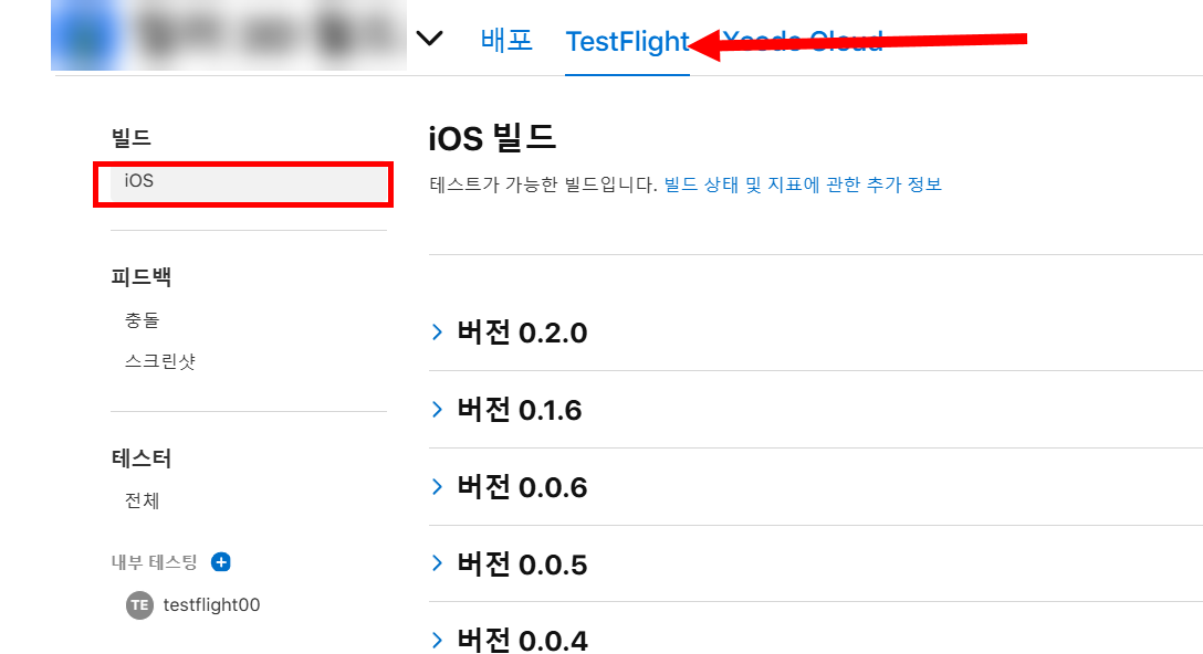 1)앱스토어 커넥트(App store connect)에서 TestFlight 메뉴로 이동합니다. Xcode에서 아카이브(Archive) 및 업로드한 iOS 빌드 목록을 확인할수있습니다. iOS 빌드의 버전에서 유니티(Unity) 또는 Xcode에서 설정 및 빌드한 버전(Version)을 표시합니다.