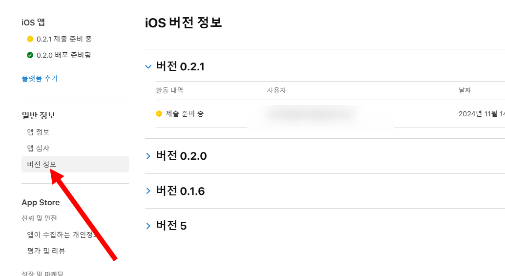 5)일반 정보의 버전 정보에서 배포한 앱의 버전 정보 목록을 표시하며 새로운 앱 제출을 준비중인 경우 해당 앱의 버전 정보를 표시합니다.