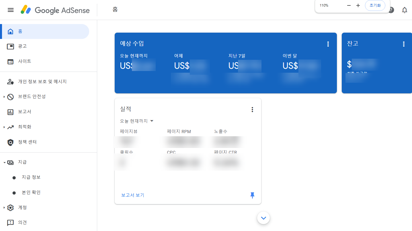 애드센스는 한달동안 예상 수입을 산정하고 다음달 초에 최종 확정된 수입을 잔액에 반영합니다(월단위 지급주기)