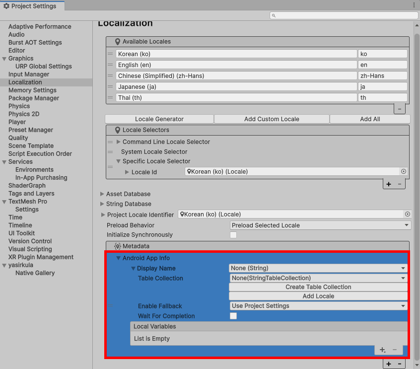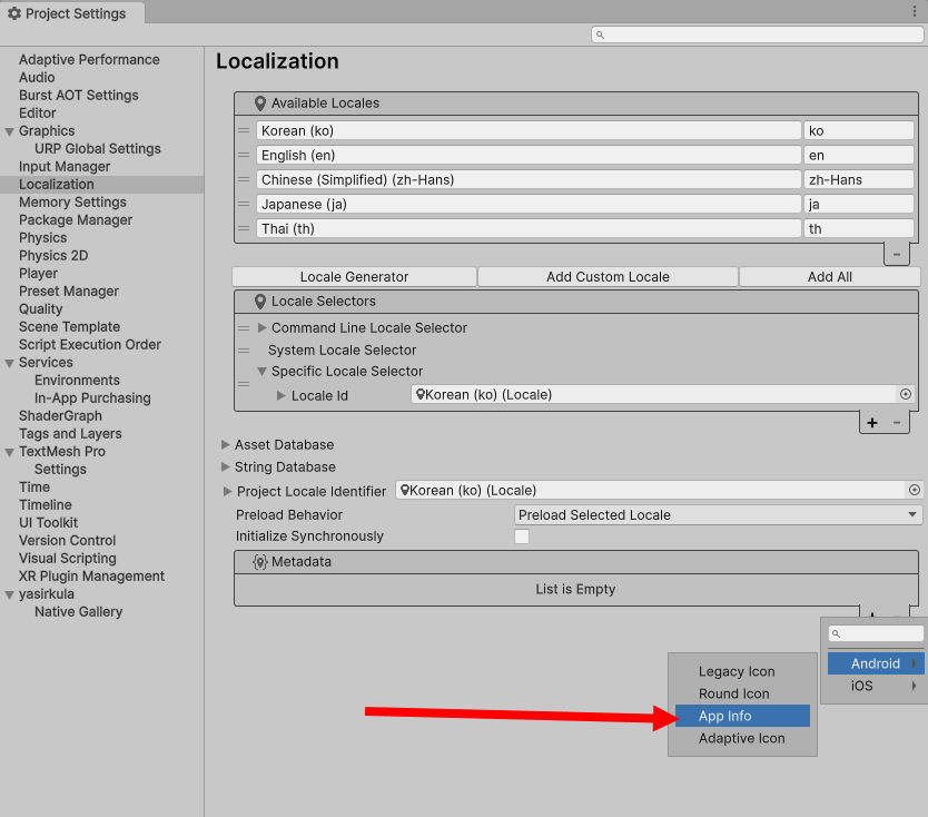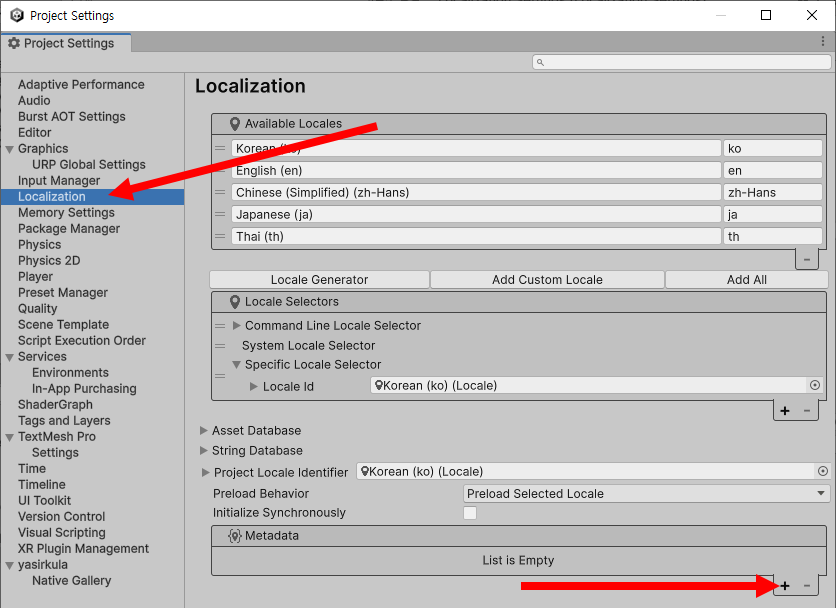 1)프로젝트 설정(project settings)의 Localization 설정으로 이동합니다. 하단의 metadata에서 +버튼을 클릭합니다.