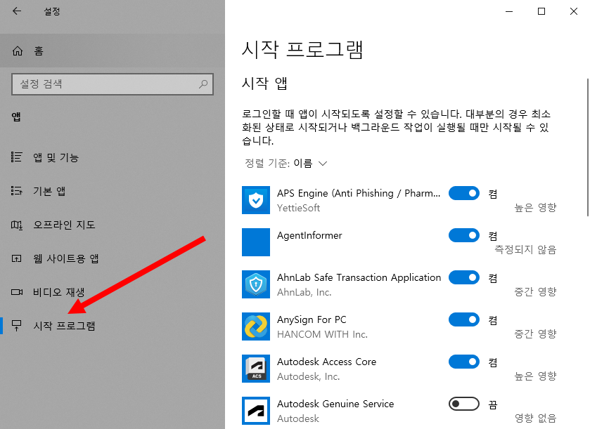 윈도우 10 설정에서 시작 프로그램 관리하기