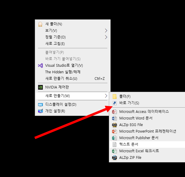 1)바탕화면에서 새로 만들기의 바로 가기를 선택합니다.