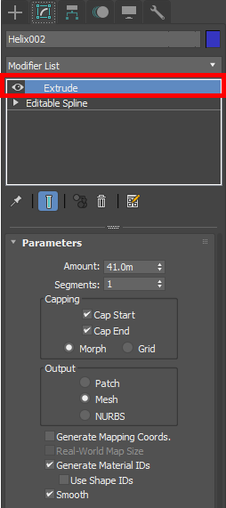 6)helix 오브젝트(스플라인)에 extrude 수정자를 추가합니다.