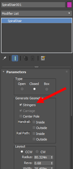 11)spiral stair 파라미터에서 stringers에 체크합니다.