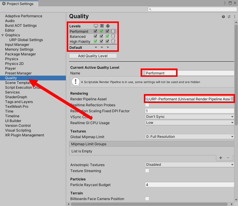 현재 유니티 에디터에서 performant 수준을 사용중이며 해당 URP 에셋 및 렌더러의 속성을 설정합니다.